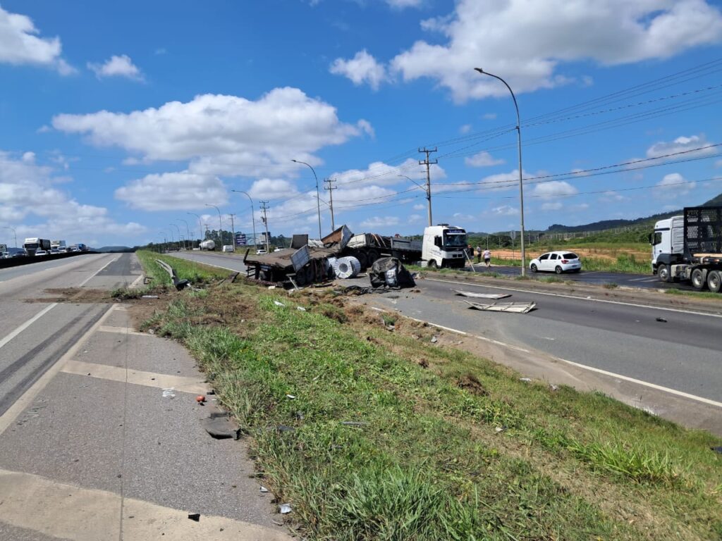 Uma carreta carregada de bobinas de metal colidiu com quatro carros na BR-101, em Balneário Piçarras, no Vale do Itajaí. O acidente ocorreu na manhã desta quarta-feira (7), por volta das 10h. Após a colisão, a carreta saiu da pista e caiu na via marginal, provocando o bloqueio total da rodovia no sentido Sul. O tráfego foi liberado cerca de uma hora depois, por volta das 11h.