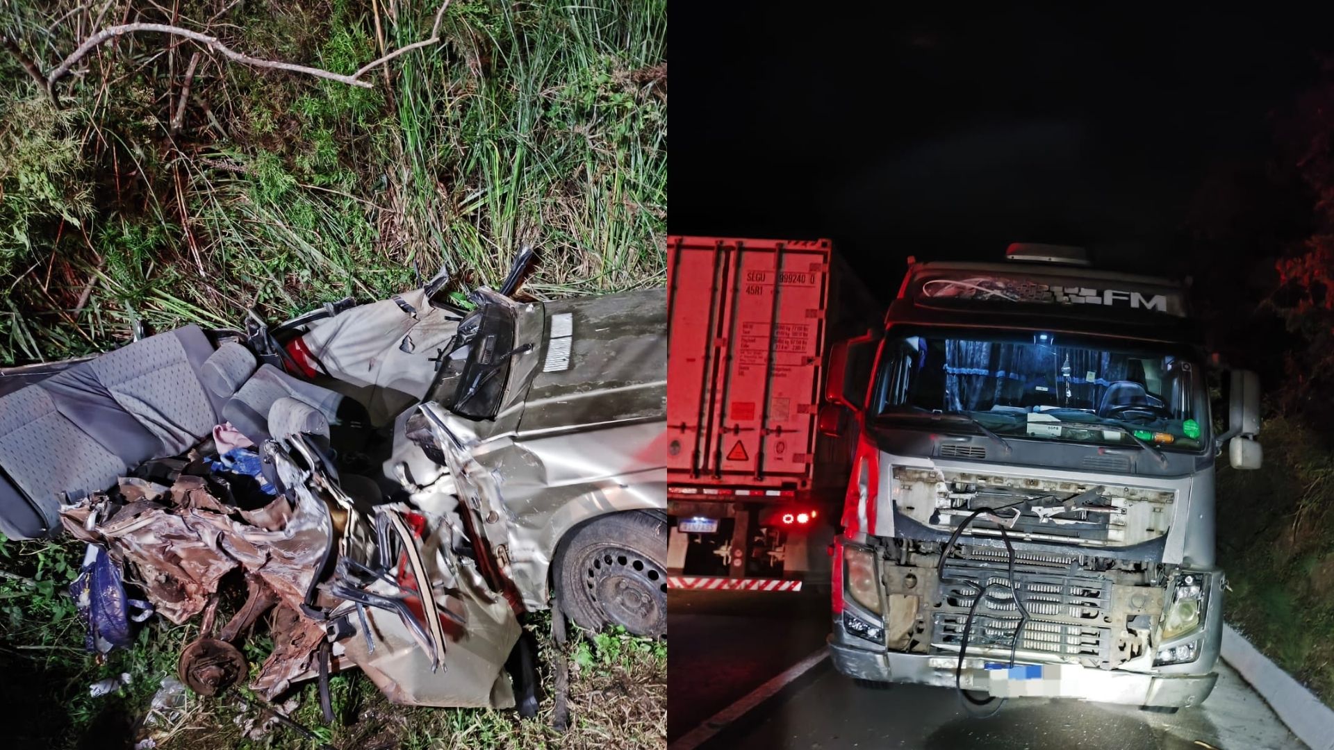Colisão violenta entre carro e caminhão prendeu vítimas às ferragens e interditou totalmente a pista