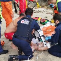 Condições do mar dificultaram a chegada de embarcações que pudessem auxiliar no desencalhe A baleia cachalote que encalhou na praia das pedras, em