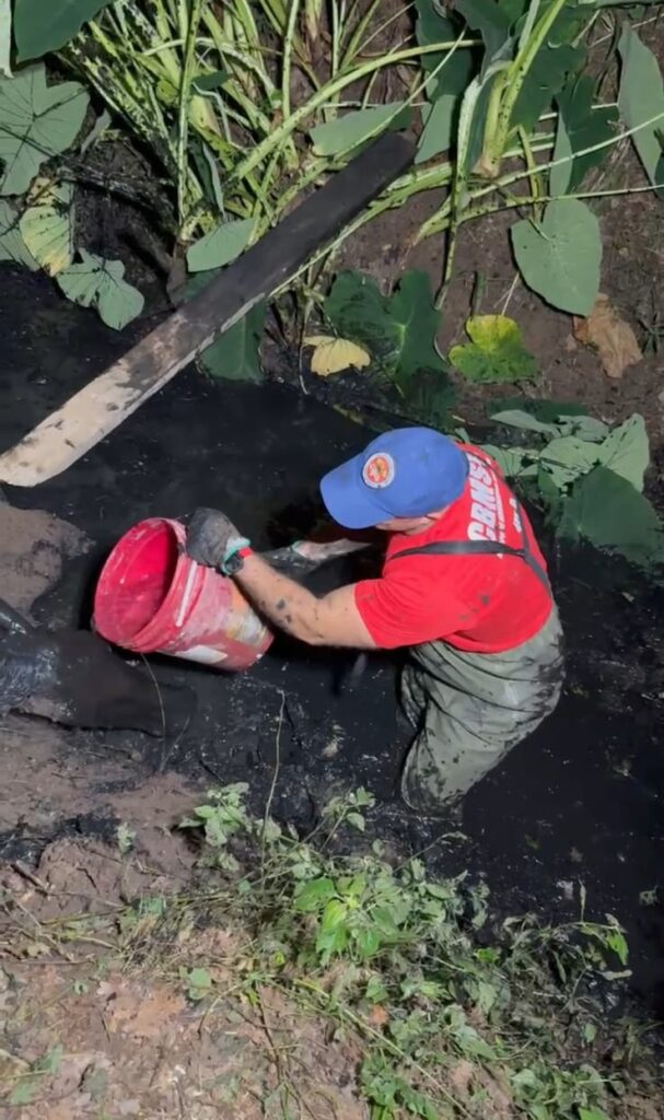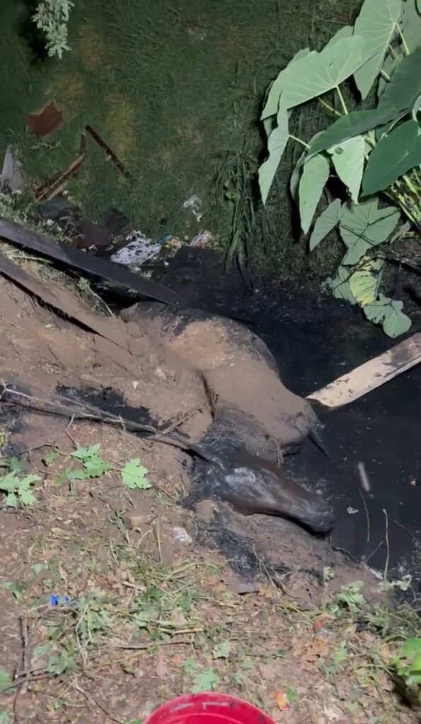 Ocorrência exigiu uso de equipamentos especiais e o apoio de uma retroescavadeira para a retirada segura do animal