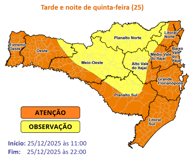 Santa Catarina segue em alerta para temporais e calor intenso nesta quinta-feira (25) de Natal. Durante a manhã, o tempo firme ainda predomina, mas a partir da tarde a combinação entre o calor, a umidade e a circulação dos ventos em diferentes níveis da atmosfera favorece a formação de temporais. As instabilidades podem vir acompanhadas de chuva intensa, raios, rajadas de vento e eventual queda de granizo, com maior intensidade no Grande Oeste, nas áreas de divisa com o Rio Grande do Sul e no Litoral catarinense.