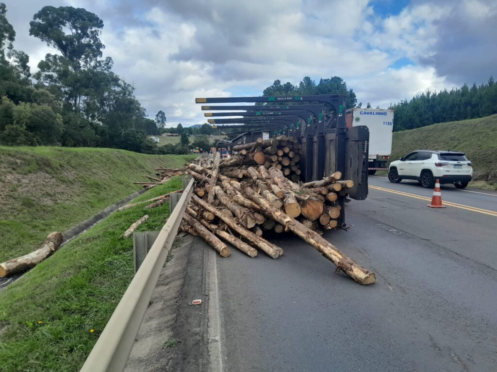 Um dos caminhões tombou sobre a via, espalhando a carga de toras de madeira pela pista. Já o segundo veículo saiu da rodovia e caiu em uma ribanceira de aproximadamente seis metros de altura, cerca de 300 metros à frente do ponto inicial do impacto.