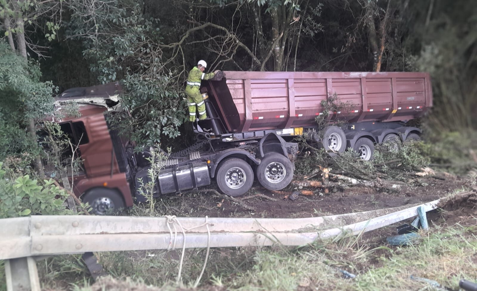 O motorista do caminhão que caiu na ribanceira ficou preso às ferragens e encarcerado entre o painel e o banco do veículo. Bombeiros comunitários que passavam pelo local foram os primeiros a prestar atendimento, iniciando os procedimentos de socorro até a chegada das equipes de resgate.