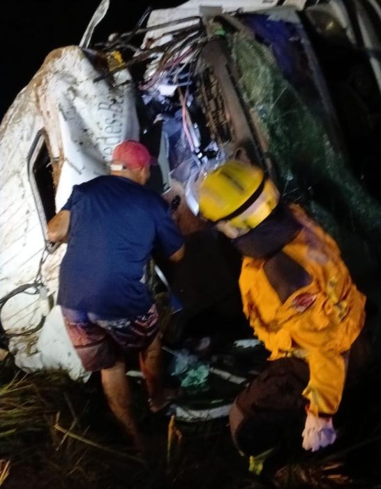 Para retirar a vítima, os bombeiros realizaram o corte da bateria do caminhão e utilizaram técnicas de resgate com expansão do teto e acesso pelo para-brisa para retirar o caminhoneiro do veículo, que estava lateralizado na ribanceira.