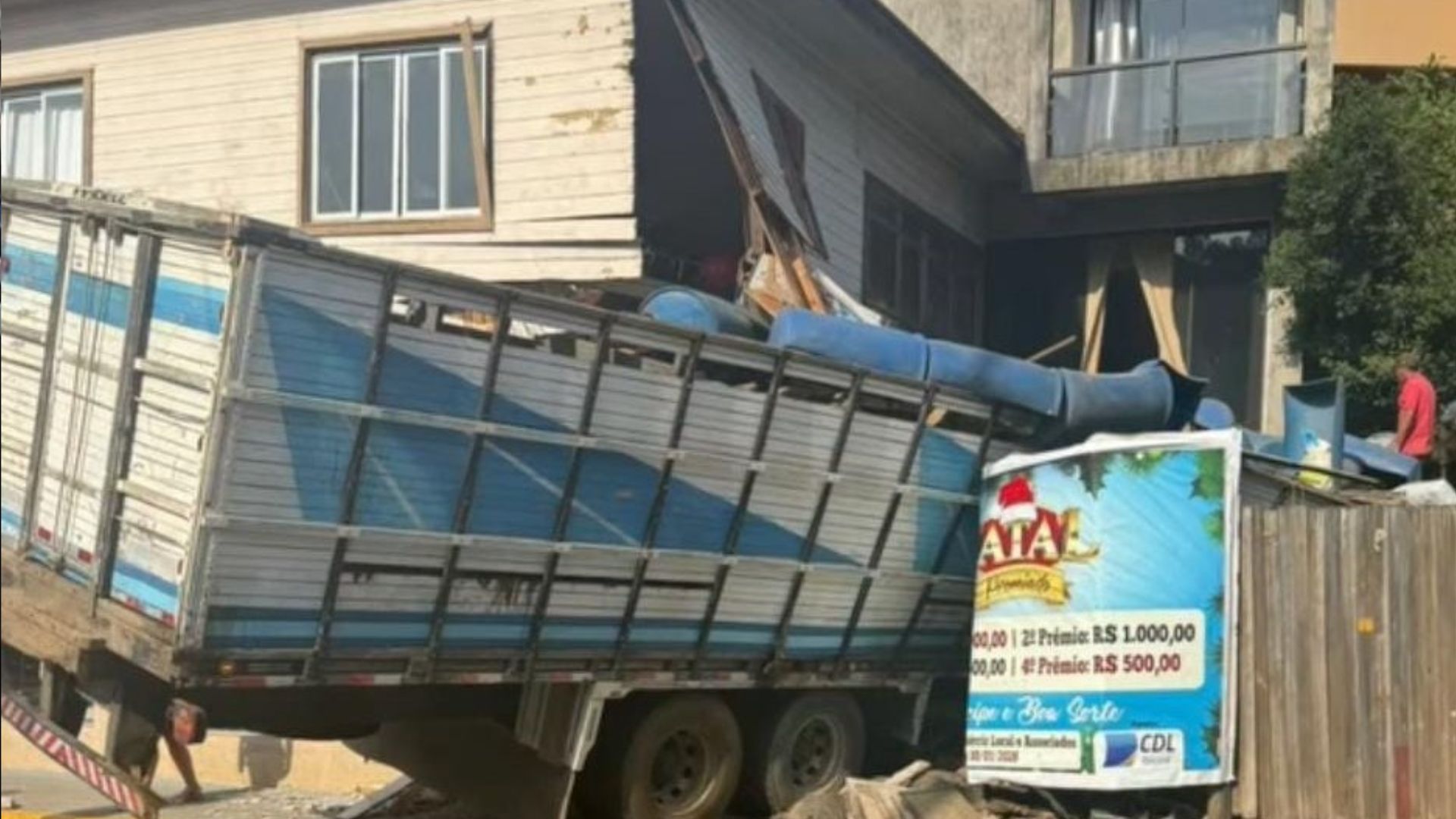 Nas imagens, é possível ver que o caminhão acertou um muro ao lado da academia e chegou a atingir o segundo andar do edifício, que ficou com parte da parede e chão destruídos.