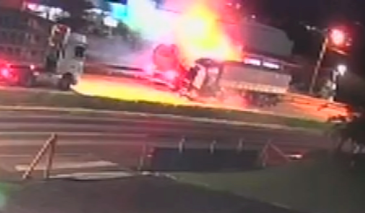 A colisão foi registrada por volta das 19h10, próximo ao elevado na entrada da cidade. Imagens de uma câmera de monitoramento registraram o momento em que os dois veículos avançam um contra o outro e o caminhão-tanque é atingido na lateral pela carreta graneleira, provocando uma explosão. As causas do acidente não foram informadas pela Polícia Rodoviária Federal (PRF).