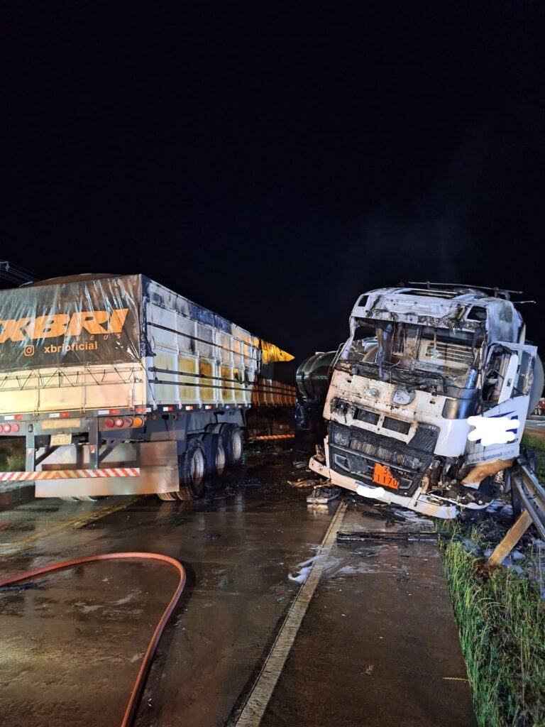 Uma colisão envolvendo dois caminhões, sendo um deles carregado com 48 mil litros de etanol, provocou um incêndio na BR-163 em São José do Cedro, no Oeste de Santa Catarina. O acidente ocorreu na noite desta terça-feira (30) e deixou um motorista em estado grave.