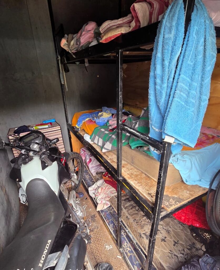 As imagens do veículo mostram que camas-beliche improvisadas foram montadas no espaço, que era compartilhado também com uma motocicleta. O caso foi encaminhado ao Ministério Público do Trabalho (MPT), que deve investigar as responsabilidades trabalhistas e as condições degradantes a que os funcionários foram submetidos.