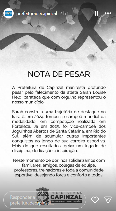 Já em 2025, Sarah foi vice-campeã dos Joguinhos Abertos de Santa Catarina (Jasc), em Rio do Sul. Em uma publicação nas redes sociais, a Prefeitura de Capinzal lamentou o falecimento da jovem e destacou o legado de disciplina, dedicação e inspiração que ela deixou. Até o momento, não foram divulgadas informações sobre o funeral.