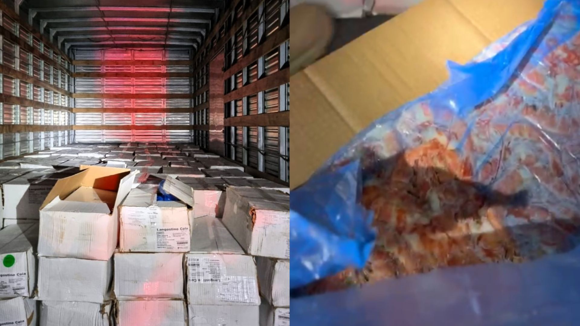 Enquanto isso, uma outra equipe da PRF, que estava nas proximidades, foi avisada e rapidamente encontrou o veículo de carga, onde foram encontradas as cinco toneladas de camarão de origem argentina. Em depoimento aos policiais, o condutor do caminhão, um homem de 58 anos, revelou que havia pego a carga em Dionísio Cerqueira, na região de fronteira com a Argentina, e receberia um pagamento para levá-la até Itajaí, no Litoral Norte – trajeto de cerca de 670 km.