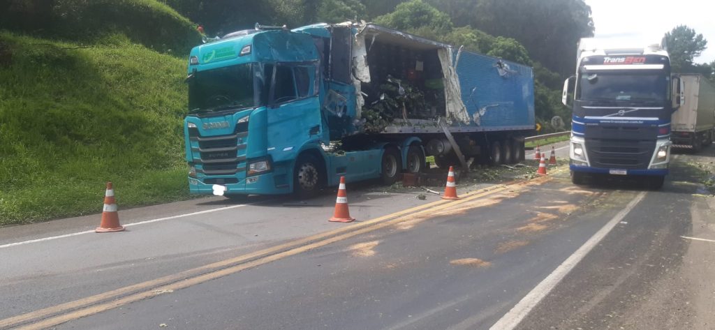 Um grave acidente de trânsito foi registrado no fim da manhã desta quinta-feira (27), por volta do km 205 da BR-282, em Ponte Alta, na Serra Catarinense. De acordo com o Corpo de Bombeiros Militar de Santa Catarina (CBMSC), a colisão ocorreu entre dois caminhões que tiveram a lateral de suas carretas destruídas pelo acidente.