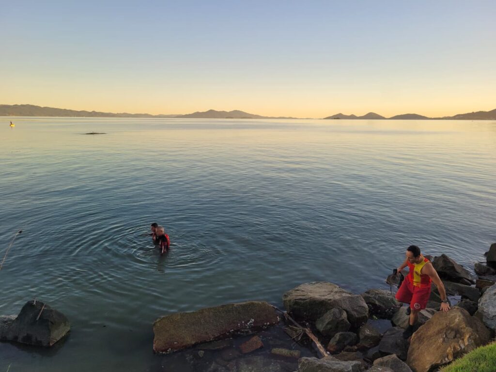 Equipes do Corpo de Bombeiros e da Guarda Municipal de Florianópolis já localizaram o veículo e fixaram uma corda, permitindo que o guincho faça a remoção do carro à superfície.