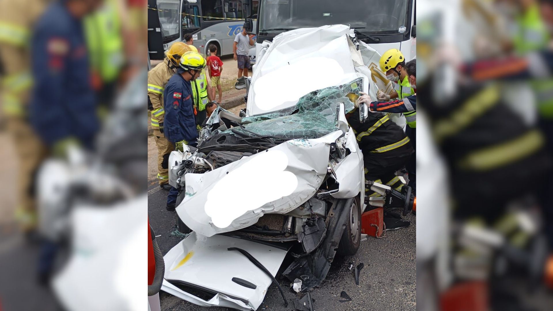 Um carro ficou completamente destruído ao ser atingido por um caminhão na traseira e ser prensado contra um outro caminhão. O acidente aconteceu no início da tarde desta quinta-feira (22), por volta das 12h25, na SC-370, na altura do município de Gravatal, no Sul do estado. O veículo era ocupado por dois homens, ambos de 34 anos, que foram resgatados e encaminhados ao hospital.