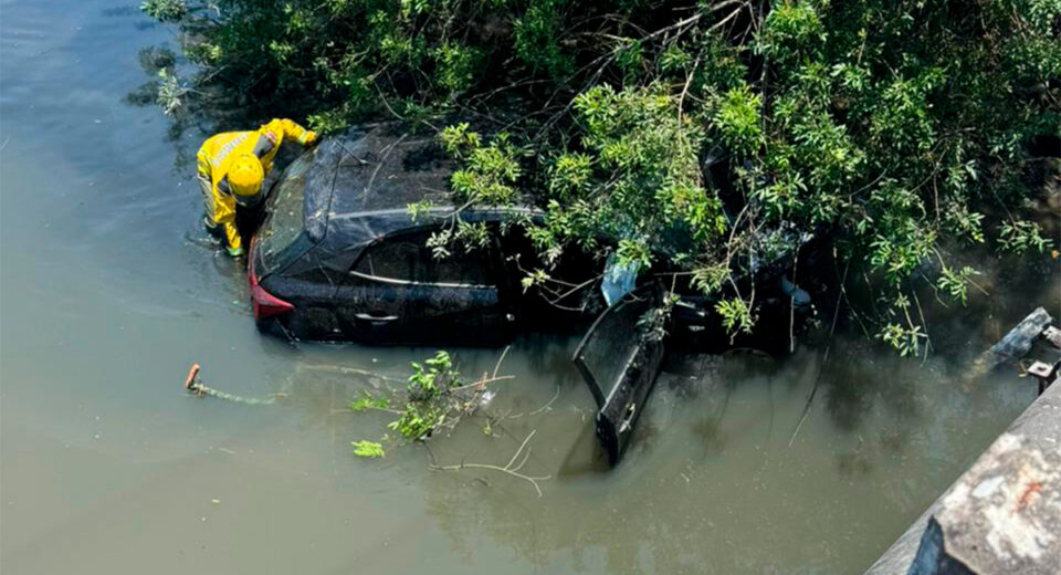 Carro invade obra, sai da pista e cai dentro de rio em Florianópolis