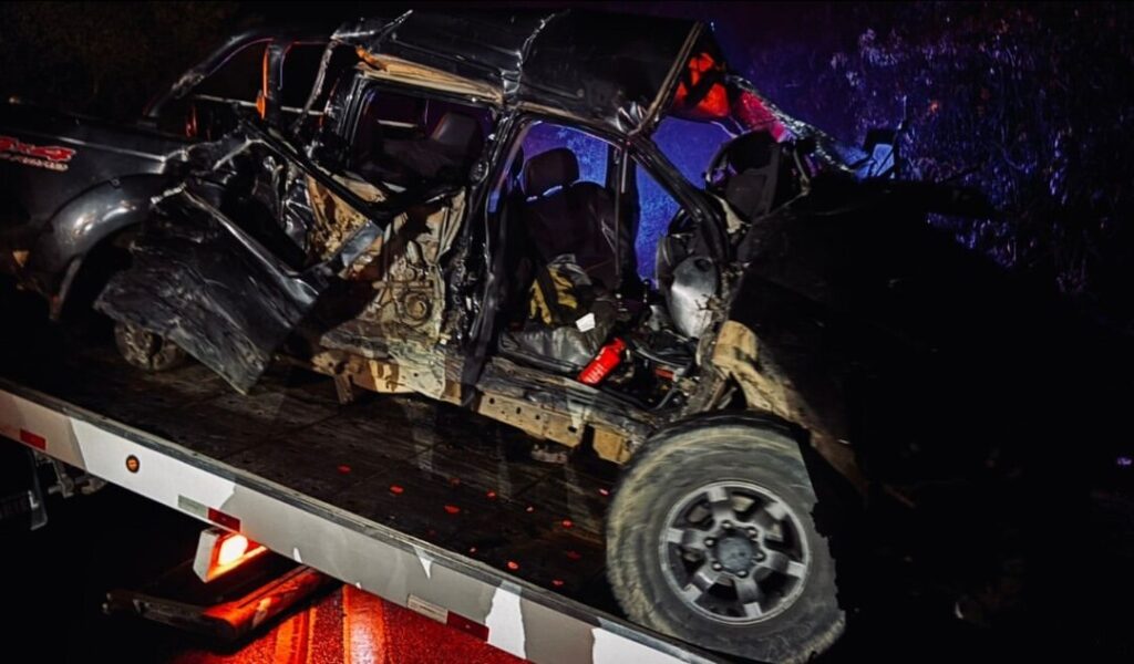 Nas imagens é possível ver que o parachoque e o parabrisas da frente do ônibus ficaram totalmente destruídos com o impacto. A caminhonete também ficou gravemente danificada e chegou a soltar uma roda e ter a estrutura retorcida.
