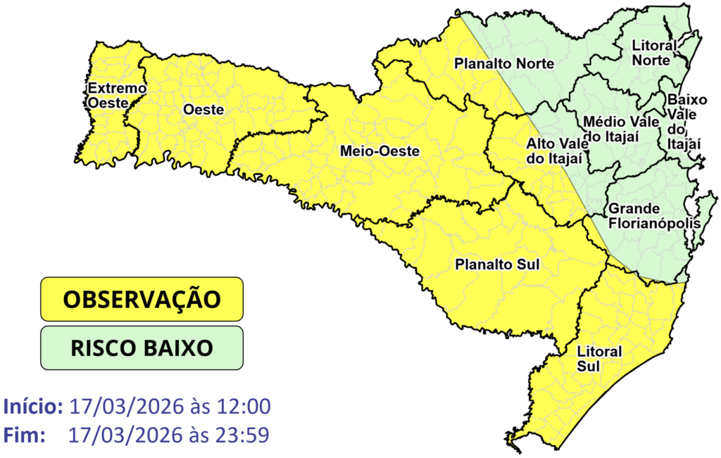 No decorrer do dia, especialmente entre a tarde e a noite, são esperados temporais isolados e chuva pontualmente intensa de formação rápida, curta duração, com potencial para rajadas de vento e trovoadas no Grande Oeste, mas também no Planalto Sul, Litoral Sul e partes do Planalto Norte e Alto Vale do Itajaí.