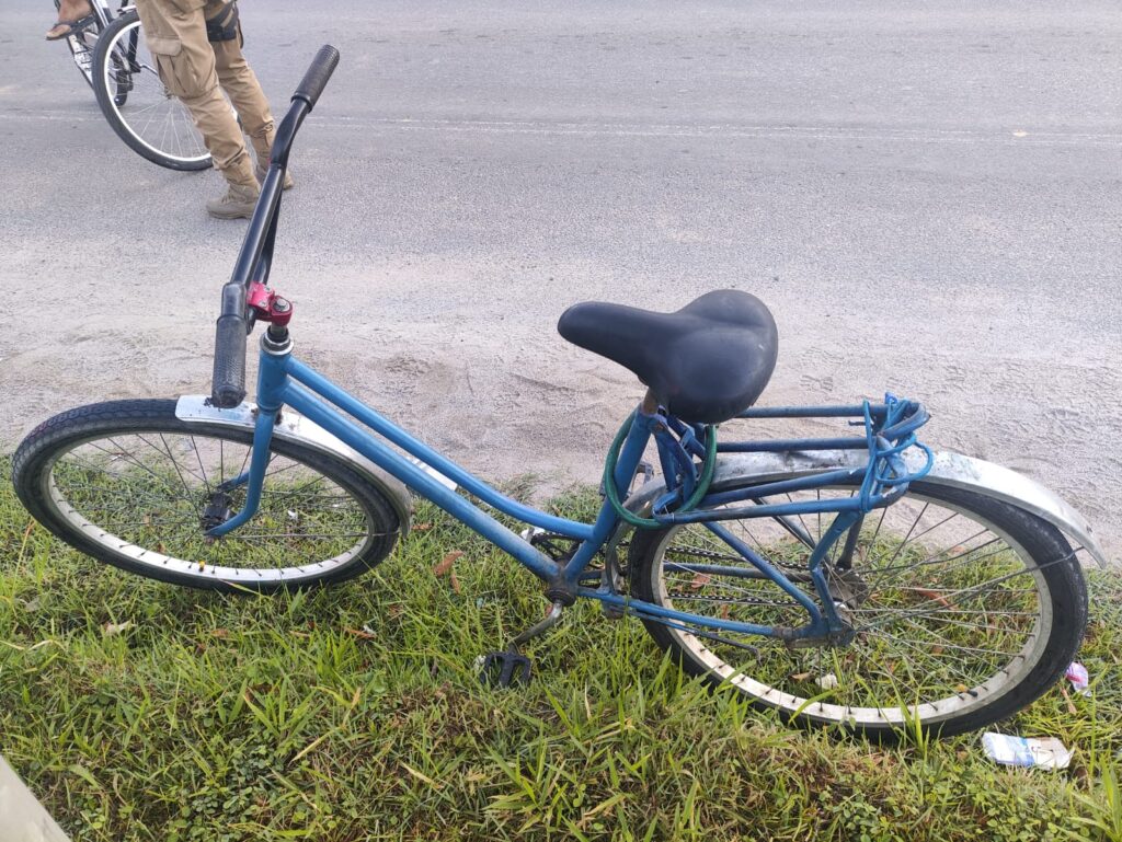 A bicicleta, de cor azul e sem marca identificada, teve danos significativos na parte traseira, incluindo roda, paralama e garupa. No local do acidente, foram encontrados vestígios como marcas de arrastamento e detritos, concentrados principalmente no acostamento da via.