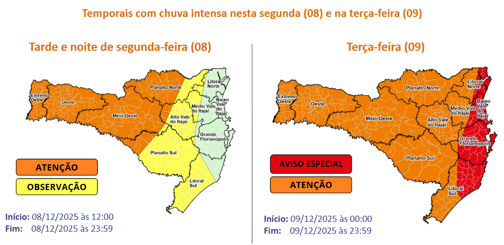 Tanto o Instituto Nacional de Meteorologia (Inmet) quanto a Defesa Civil de Santa Catarina emitiram notas meteorológicas e avisos especiais alertando para os possíveis impactos dos temporais. Já nesta segunda-feira, o risco é moderado a alto para ocorrências como alagamentos, enxurradas, destelhamentos, queda de galhos e árvores e danos na rede elétrica em todo o Grande Oeste, Planaltos, Litoral Sul e Alto Vale.