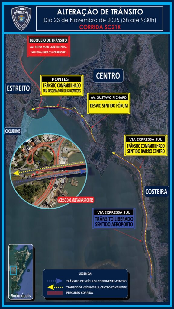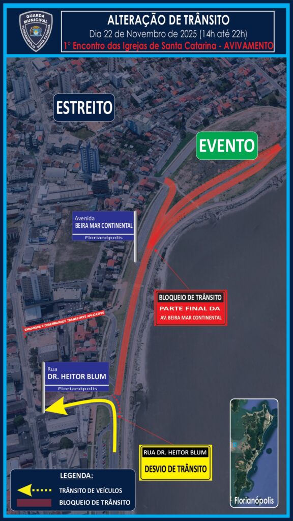 No sábado (22), as alterações começam a partir das 14h e se mantêm na região continental para a realização do 1º Encontro das Igrejas de Santa Catarina – Tempo de Avivamento. A Avenida Beira-Mar Continental vai ficar bloqueada para carros apenas no trecho a partir da Rua Dr. Heitor Blum até a região do bolsão, próximo ao Balneário do Estreito. O desvio para quem trafega pela Avenida Beira-Mar Continental vai ser feito em direção ao bairro Estreito na própria Rua Dr. Heitor Blum. O trânsito deve ser liberado para veículos após às 22h.