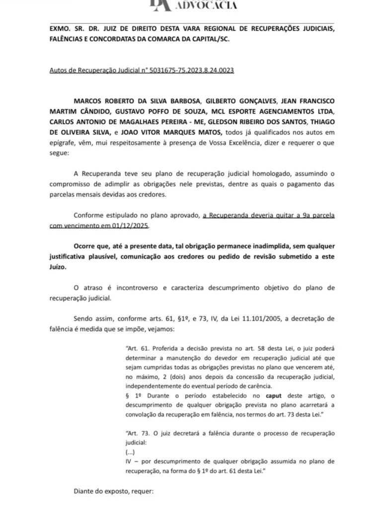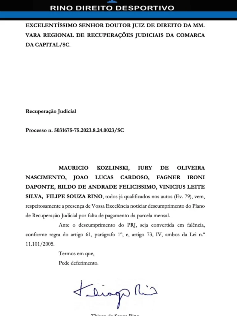 O pedido de falência foi feito por Maurício Kozlinski (2016-2018), Iury (2018-2021 e que jogou no Figueirense neste ano), João Lucas (2020-2021), Fagner Alemão (2017-2018), Rildo (2020), Vinícius Leite (2020-2022), Marquinhos Silva (2018-2019), Jean Martim (2020-2021), Gustavo Poffo (2020-2022), Gledson (2019-2022), Thiaguinho (base e profissional em 2021) e João Vitor (base e profissional em 2021). Além dos jogadores, ainda consta no processo: Filipe Souza Rino, Gilberto Golçalves, MCL Esporte Agenciamento LCA e Carlos Antonio de Magalhães Pereira – ME.