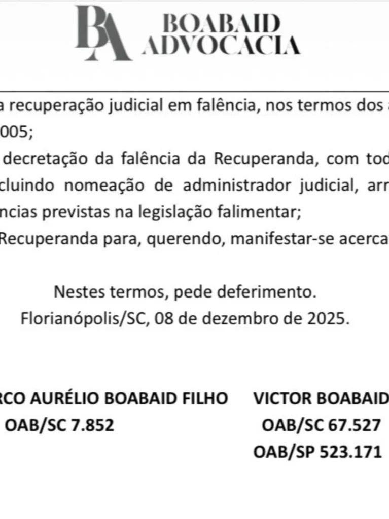 Um grupo de 16 credores do Avaí entrou na justiça e pediu a falência do clube após o atraso no pagamento de uma das parcelas da Recuperação Judicial. O valor de R$ 350 mil deveria ter sido pago até o dia 1º deste mês, no entanto, segundo pedido dos credores, não foi feito até o momento. A informação foi divulgada pelo repórter Gustavo Willamil, do Grupo Veg Esportes. A reportagem do Portal TVBV Online entrou em contato com o clube, mas não obteve resposta até o momento do fechamento desta reportagem.