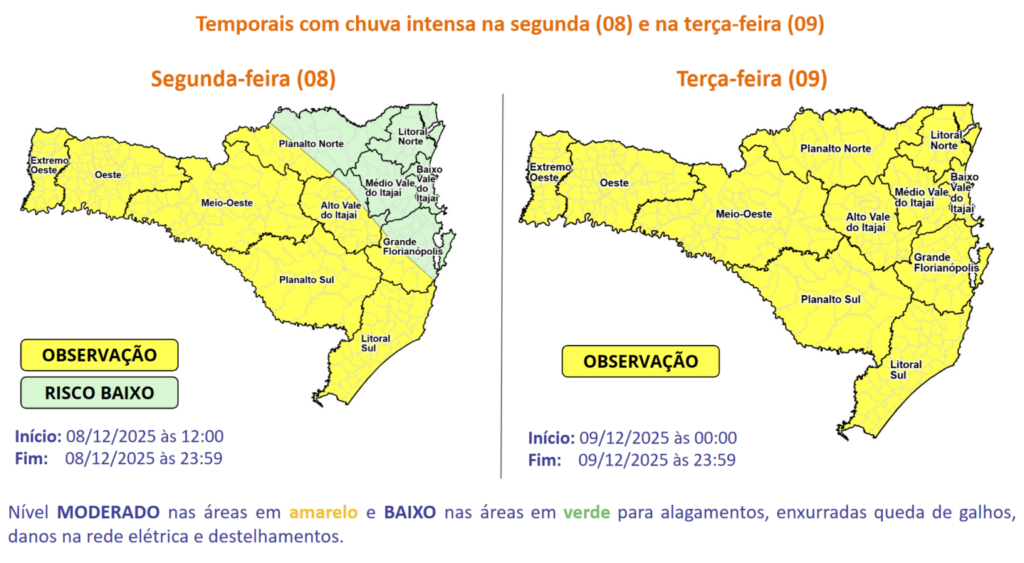 Ao longo da tarde e noite de segunda (8), há condições para tempestades especialmente no Grande Oeste e nas áreas que fazem divisa com o Rio Grande do Sul. O risco é moderado a alto para ocorrências como destelhamentos, queda de galhos e árvores, danos na rede elétrica, alagamentos e enxurradas pontuais no Grande Oeste, Alto Vale do Itajái, Grande Florianópolis Serrana, Litoral Sul e Planaltos, e baixo nas demais regiões.