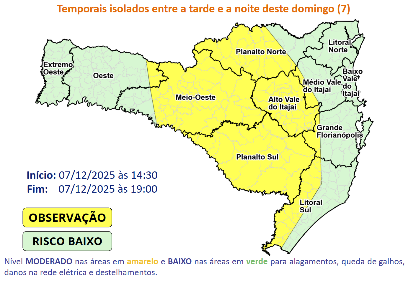 Uma nota meteorológica da Defesa Civil do estado alerta para ocorrências no Meio-Oeste, Planalto Sul, Planalto Norte, Alto Vale do Itajaí e parte do Litoral Sul . Nas demais regiões, o risco é baixo, com chuva mais isolada, intercalada por períodos de melhoria com sol e calor.