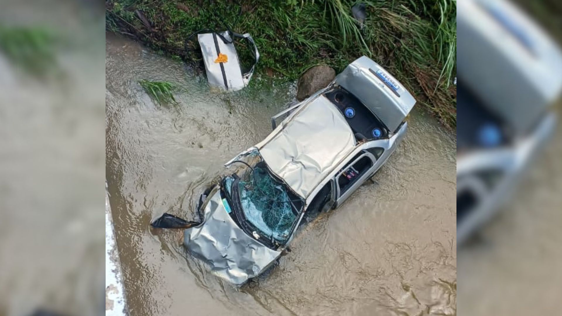 Na foto é possível ver que o veículo ficou com o teto e o capô totalmente amassados e o parabrisas destruído com o impacto da queda. Além das equipes de resgate, a Polícia Rodoviária Federal (PRF) também esteve no local do acidente.