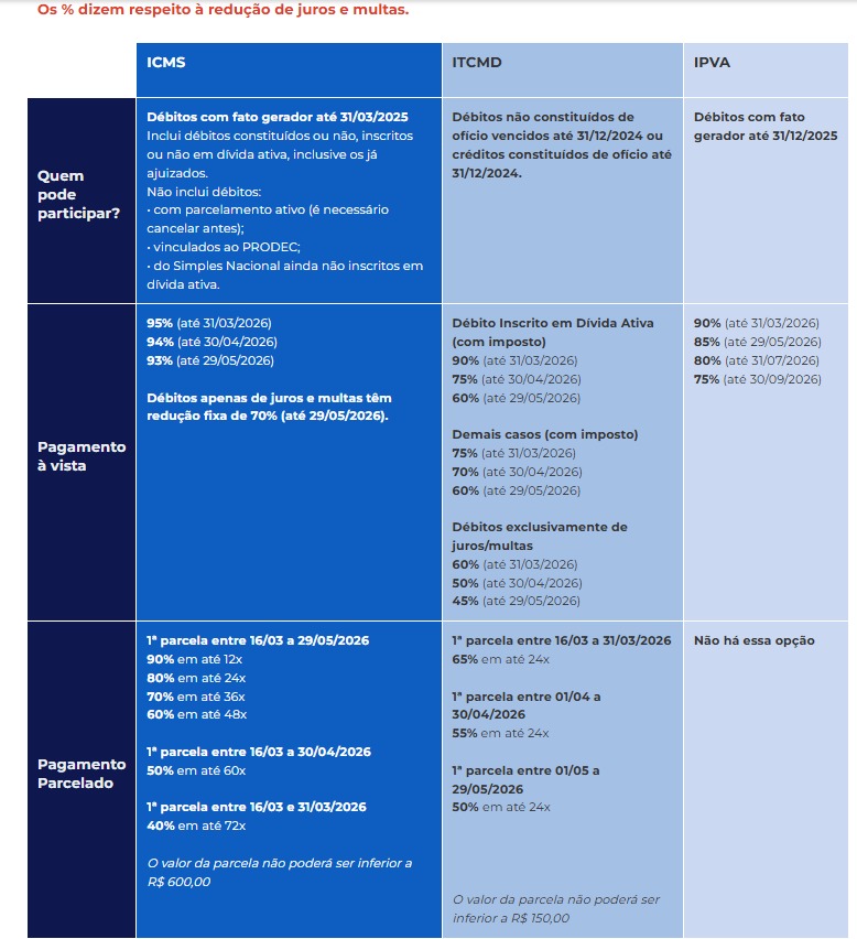 O programa engloba débitos de ICMS gerados até 31 de março de 2025 e oferece descontos sobre juros e multas de até 95% para pagamento à vista, além de opções de parcelamento que podem chegar até 72 vezes (confira a tabela abaixo para verificar as opções para o IPVA e ITCMD). O prazo para quitação do ICMS vai até o final de maio.