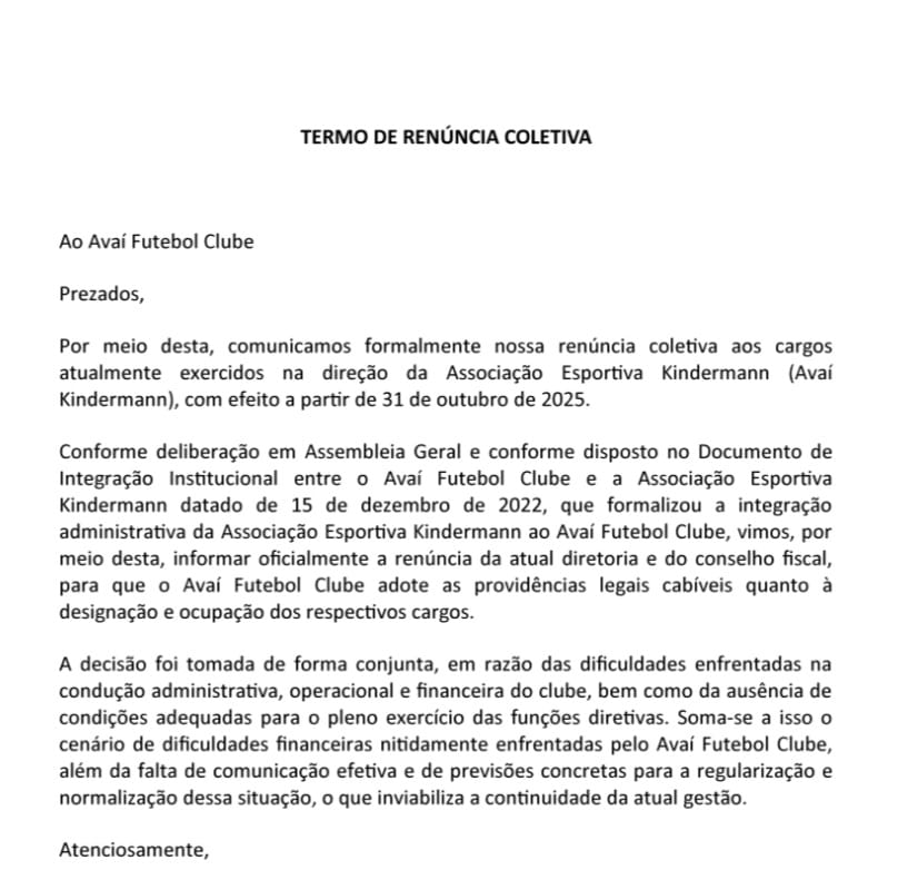 Por meio desta, comunicamos formalmente nossa renúncia coletiva aos cargos atualmente exercidos na direção da Associação Esportiva Kindermann (Avaí Kindermann), com efeito a partir de 31 de outubro de 2025.