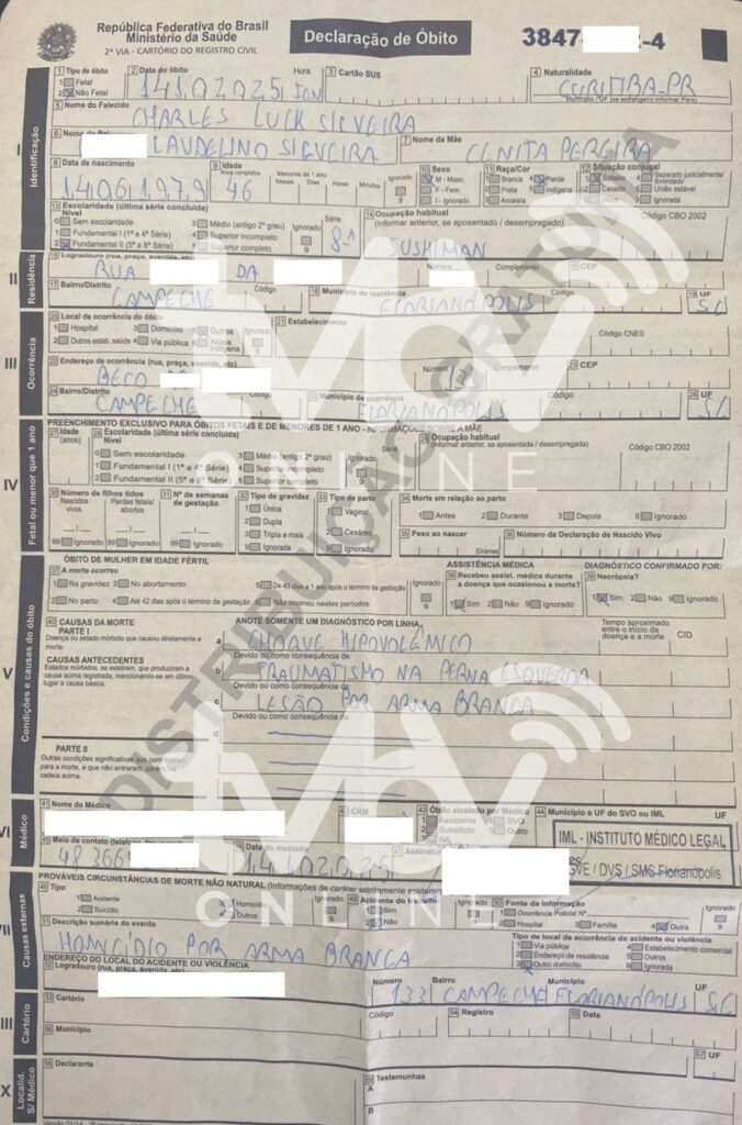 A ocorrência que chocou Florianópolis na última terça-feira (14) teve uma verdadeira reviravolta. As informações, que a princípio foram divulgadas pelos órgãos de segurança, apontavam que um homem teria sido morto por um cão após invadir uma propriedade no bairro Campeche, no Sul da Ilha. Agora o caso deve tomar um novo rumo com base nos resultados dos exames cadavéricos. O Portal TVBV Online teve acesso, com exclusividade, a certidão de óbito que aponta que Charles Luck Silveira, de 46 anos, foi vítima de “homicídio por arma branca”.
