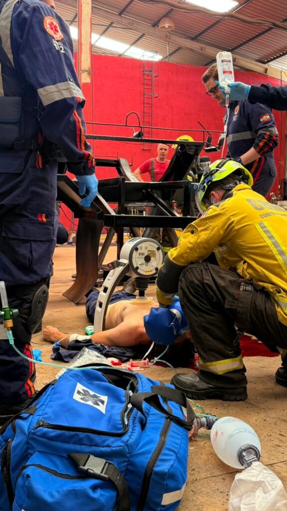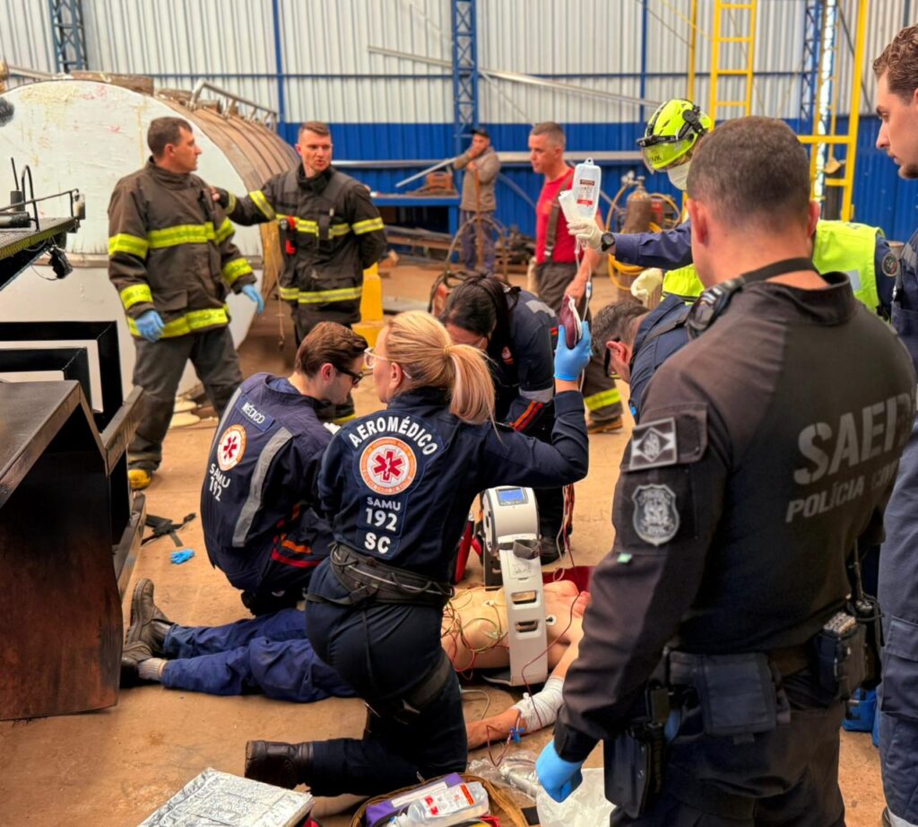 O acidente ocorreu por volta das 8h30 em uma indústria de manutenção tanques rodoviários às margens da BR-282, na divisa com o município de Cordilheira Alta. O Serviço Aeropolicial (SAER) da Polícia Civil (PCSC) levou os paramédicos de helicóptero até o local para o atendimento urgente da vítima.