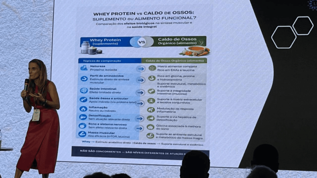 Um dos principais pontos da apresentação foi a comparação entre o caldo de ossos e o whey protein. Enquanto o whey é rico em leucina e associado ao estímulo anabólico, o caldo de ossos se destaca pela presença de aminoácidos como glicina, prolina e hidroxiprolina — fundamentais para processos anti-inflamatórios, saúde intestinal e manutenção estrutural do corpo.