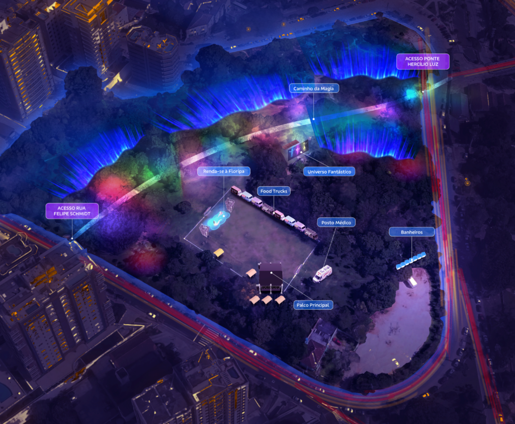 Esta é a primeira vez na América Latina que será realizado um festival de luzes totalmente interativo em um parque urbano onde o público também será criador da própria obra. Em cada passo e gesto as luzes se acenderão em um misto de cores, sons e formas. Serão quatro noites para que os visitantes passem pelos cinco percursos temáticos inspirados na Ilha de Santa Catarina. Essa viagem vai passar pelas lendas, cultura e vai estar estampada na arte digital.