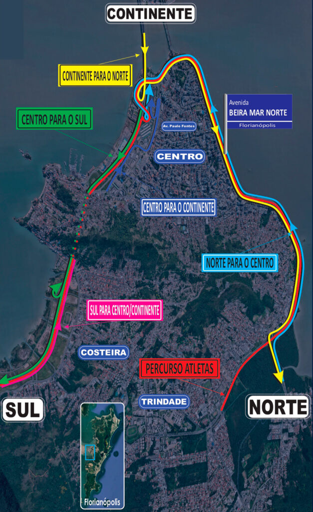 Na Avenida Beira-mar Norte, as faixas junto aos canteiros centrais serão destinadas aos atletas em ambos os sentidos. Em razão disso, os acessos transversais à Beira-mar estarão bloqueados. Quem transitar pela via sentido norte-centro, poderá apenas seguir até o Sul da Ilha ou acessar a ponte Colombo Salles. Para ir ao centro, o motorista deve seguir pela Avenida Gustavo Richard e fazer o retorno pela Prainha, sob o Túnel Antonieta de Barros.