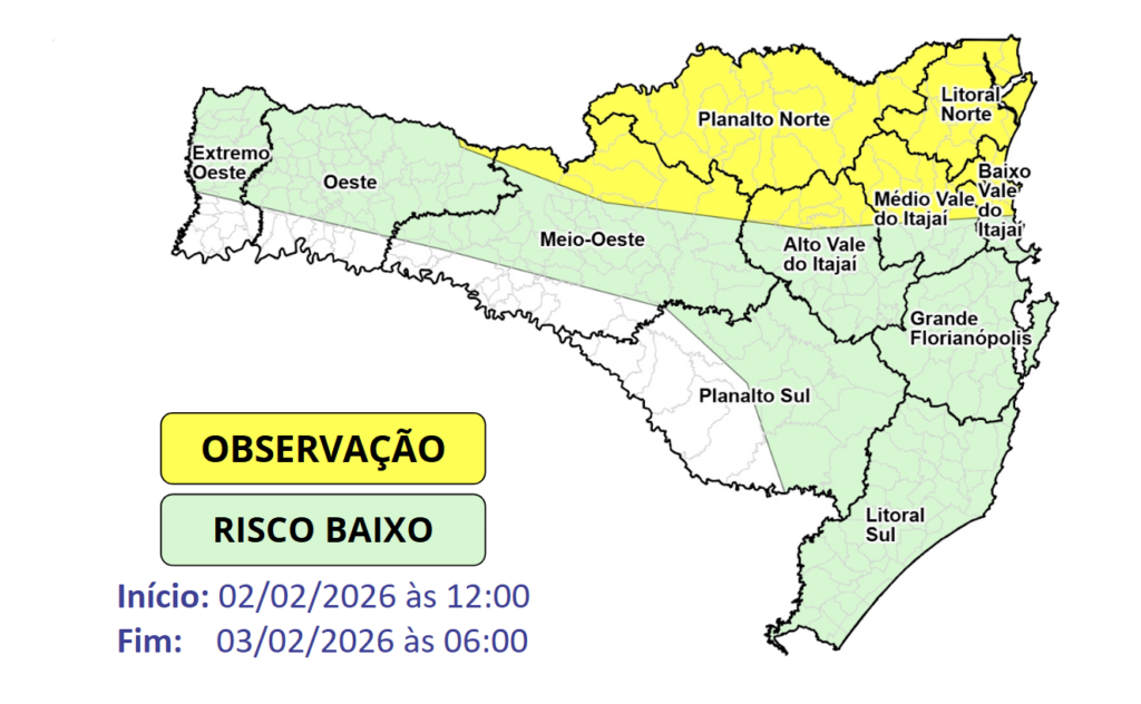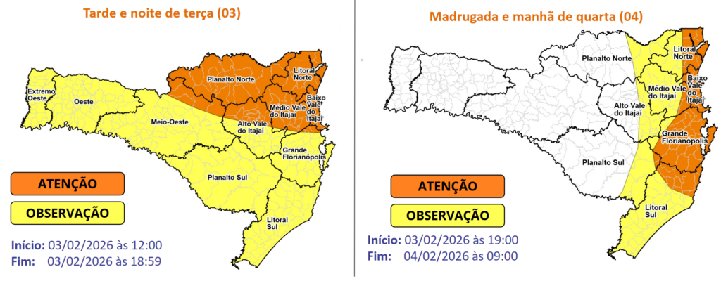 As instabilidades mais intensas estão previstas entre a tarde de terça e a manhã de quarta-feira (4), quando a formação do ciclone extratropical no mar reforça os temporais no leste de Santa Catarina, aumentando o risco para chuva intensa e persistente. Essa condição persiste durante a madrugada e manhã de quarta-feira (4), especialmente no Litoral Norte, Baixo Vale do Itajaí, Grande Florianópolis e parte do Litoral Sul, onde o risco é maior para alagamentos e enxurradas.