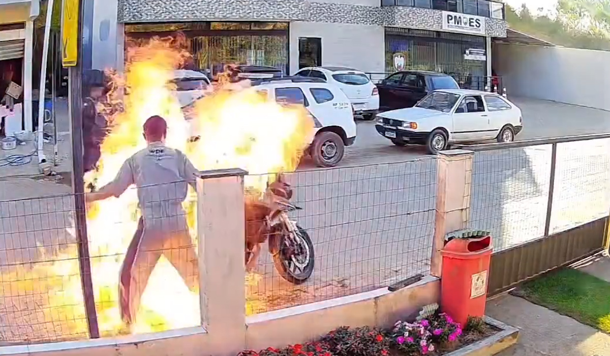 Câmeras de segurança registraram o momento em que ele derramou o combustível sobre a moto e acendeu um fósforo. As chamas se espalharam rapidamente e atingiram a mãe, que estava próxima tentando contê-lo. Ela caiu no chão e foi socorrida por uma testemunha. A ação foi tão rápida que os dois policiais presentes não conseguiram impedi-la.