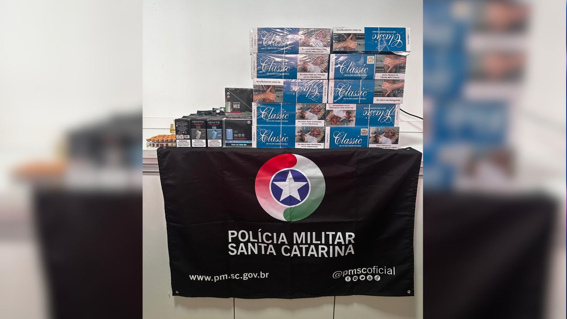 No interior das bagagens, foram apreendidos aproximadamente 1.000 maços de cigarros, 102 unidades de cigarros eletrônicos e 48 unidades do medicamento tirzepatida (mounjaro). O valor estimado da carga é de cerca de R$ 35 mil.