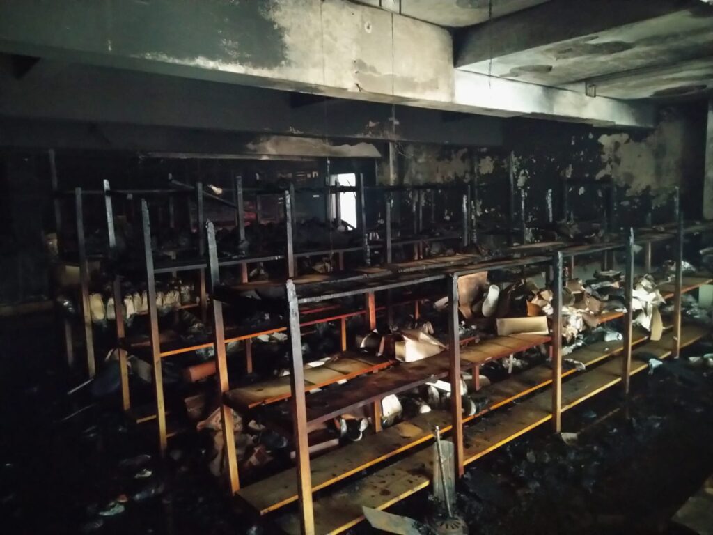 De acordo com os bombeiros, o fogo atingiu o imóvel que tinha aproximadamente 150 metros quadrados e as chamas já estavam em fase de crescimento quando as equipes chegaram ao local. As chamas se concentravam na parte da frente do primeiro pavimento, onde funcionava o estoque da loja, com grande quantidade de caixas de calçados armazenadas em prateleiras de madeira. Um mezanino de madeira, de cerca de 9 metros quadrados, chegou a colapsar durante o incêndio.