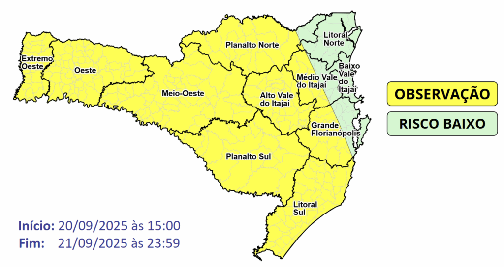 De acordo com a Defesa Civil, praticamente todo o estado tem risco moderado para ocorrências associadas a destelhamentos, danos na rede elétrica, queda de galhos e árvores e danos na rede elétrica, alagamentos e enxurradas. Apenas o Litoral Norte, o Baixo Vale do Itajaí e a metade leste do Médio Vale e da Grande Florianópolis têm previsão de risco baixo.