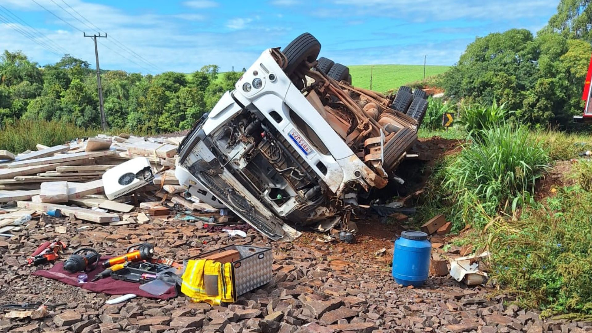 O acidente aconteceu na parte da manhã, por volta das 8h30, no município de Guarujá do Sul. Equipes dos quartéis de São José do Cedro e Dionísio Cerqueira foram acionadas para atendimento. Quando as viaturas chegaram ao local, situado próximo à área industrial, em um trecho conhecido por graves acidentes automobilísticos, encontraram a carreta tombada e todo o material que estava sendo transportado no chão. O condutor, identificado como um homem de 39 anos, já estava fora do veículo e apresentada ferimentos pelo corpo. Ele foi atendido, acalmado pelos oficiais e encaminhado ao hospital.