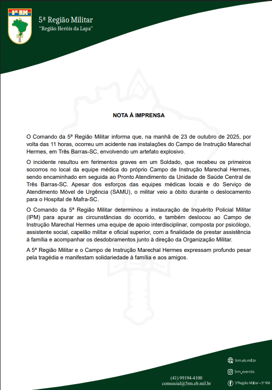 “A 5ª Região Militar e o Campo de Instrução Marechal Hermes expressam profundo pesar pela tragédia e manifestam solidariedade à família e aos amigos”, finaliza a instituição em nota.