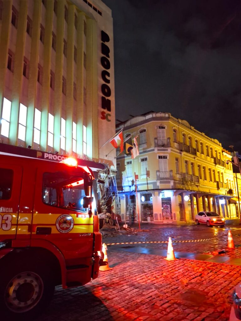 Parte da marquise do prédio onde funciona o serviço de Proteção e Defesa do Consumidor (Procon) desabou na noite deste domingo (18), no Centro de Florianópolis. Por conta dos acidentes, os atendimentos presenciais foram suspensos até as 12h desta segunda-feira (19). De acordo com o Corpo de Bombeiros Militar de Santa Catarina (CBMSC), a área foi isolada pelos bombeiros, e não há registro de feridos.