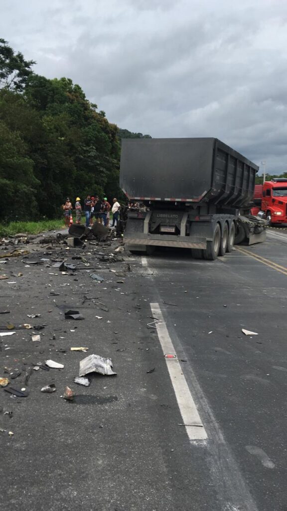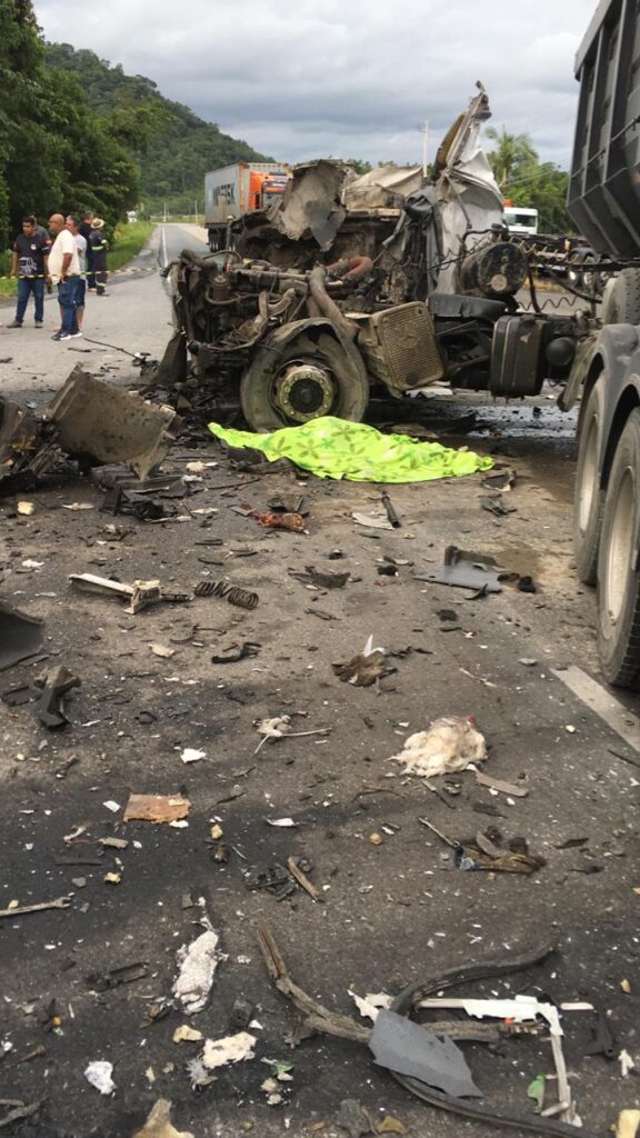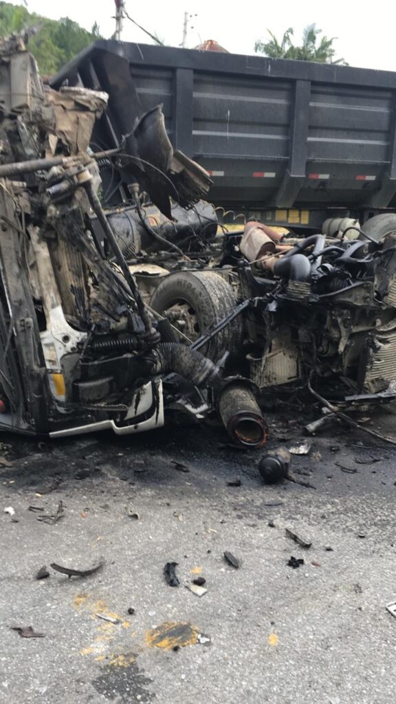 Um grave acidente de trânsito envolvendo dois veículos pesados resultou na morte de um motorista na tarde desta segunda-feira (2). A ocorrência foi registrada na SC-416, no município de Garuva, no Norte de Santa Catarina, por volta das 15h10. Segundo informações do Corpo de Bombeiros Militar de Santa Catarina (CBMSC), o acidente envolveu um caminhão caçamba, que ao colidir com uma carreta de nove eixos, o condutor perdeu o controle do veículo e veio a óbito ainda no local. Os destroços da colisão ficaram espalhados por toda a pista, que ficou interditada por algumas horas.