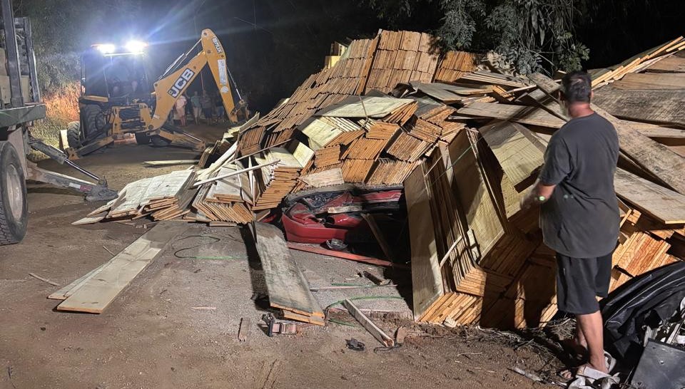 Na colisão um caminhão carregado com tábuas de madeira tombou sobre o carro onde as vítimas estavam
