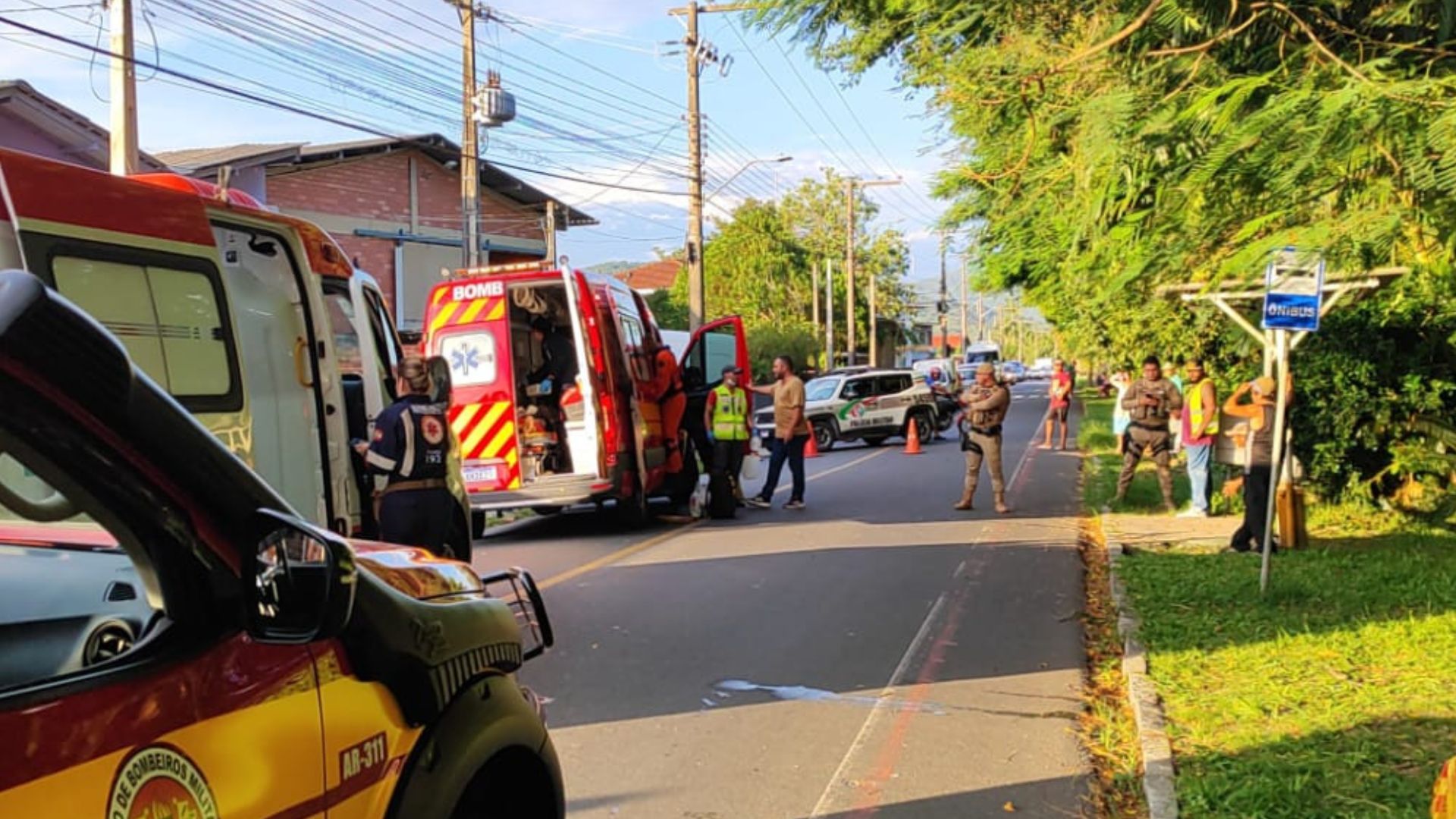Quando o Corpo de Bombeiros Militar (CBMSC) chegou ao local do acidente, o homem foi encontrado caído na calçada, ainda consciente, porém, sem responder a estímulos. Foram constatadas uma grave lesão e fratura no rosto, além de fratura no crânio. Devido ao estado de saúde da vítima, ela foi conduzida ao Hospital Santa Isabel, em Blumenau, a cerca de 16 km de distância do local do acidente.