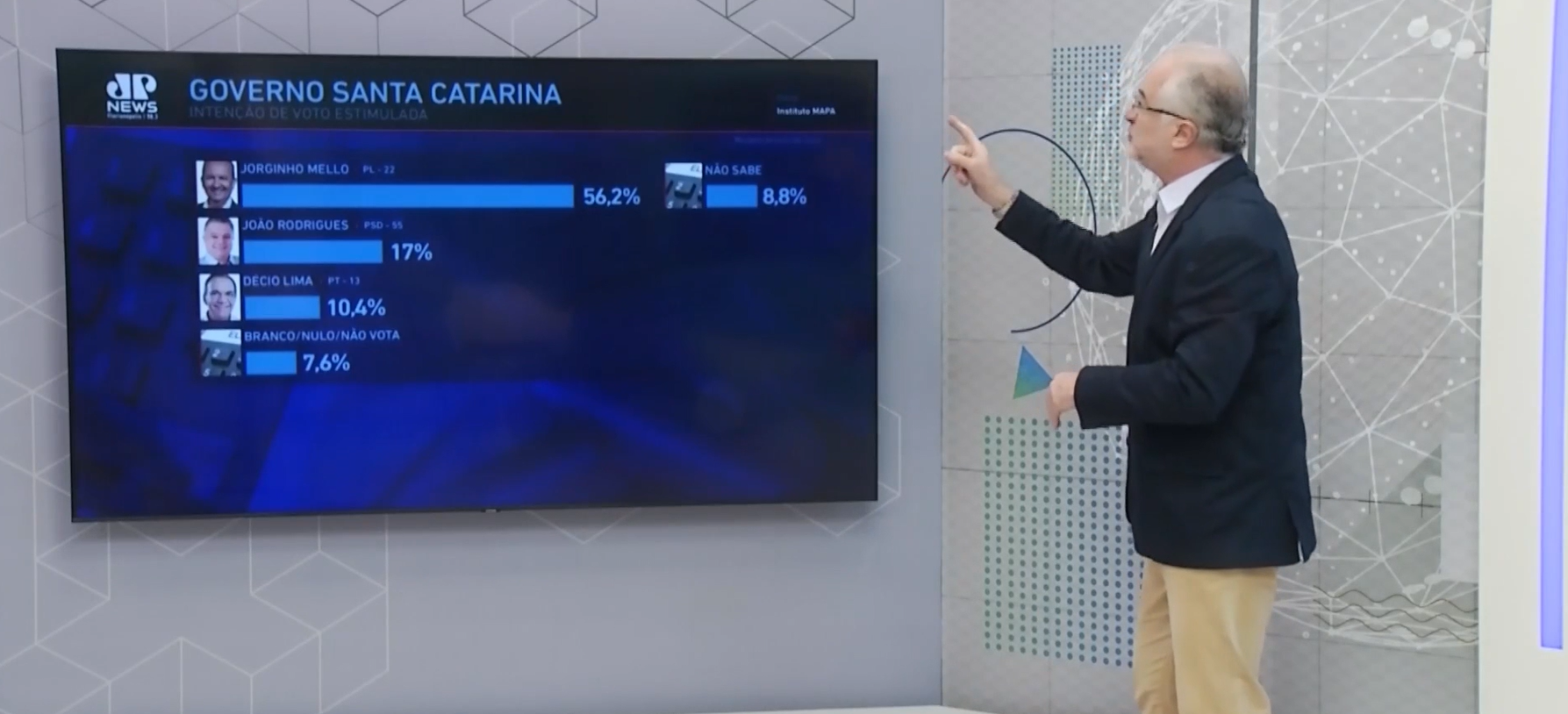 Na pesquisa espontânea, onde o entrevistado responde sem ouvir os nomes dos candidatos antes, o atual governador lidera com 30%. Nesta modalidade, mais de 50% responderam que não sabem. Já na estimulada, onde os nomes são citados, Jorginho liderou com 56,2% contra João Rodrigues e Décio Lima. Se este cenário se confirmar, ele se elege ainda no primeiro turno. Já em um cenário de segundo turno contra o prefeito de Chapecó, o governador ganha com 58%. Este foi o tema do comentário desta quarta-feira (17).
