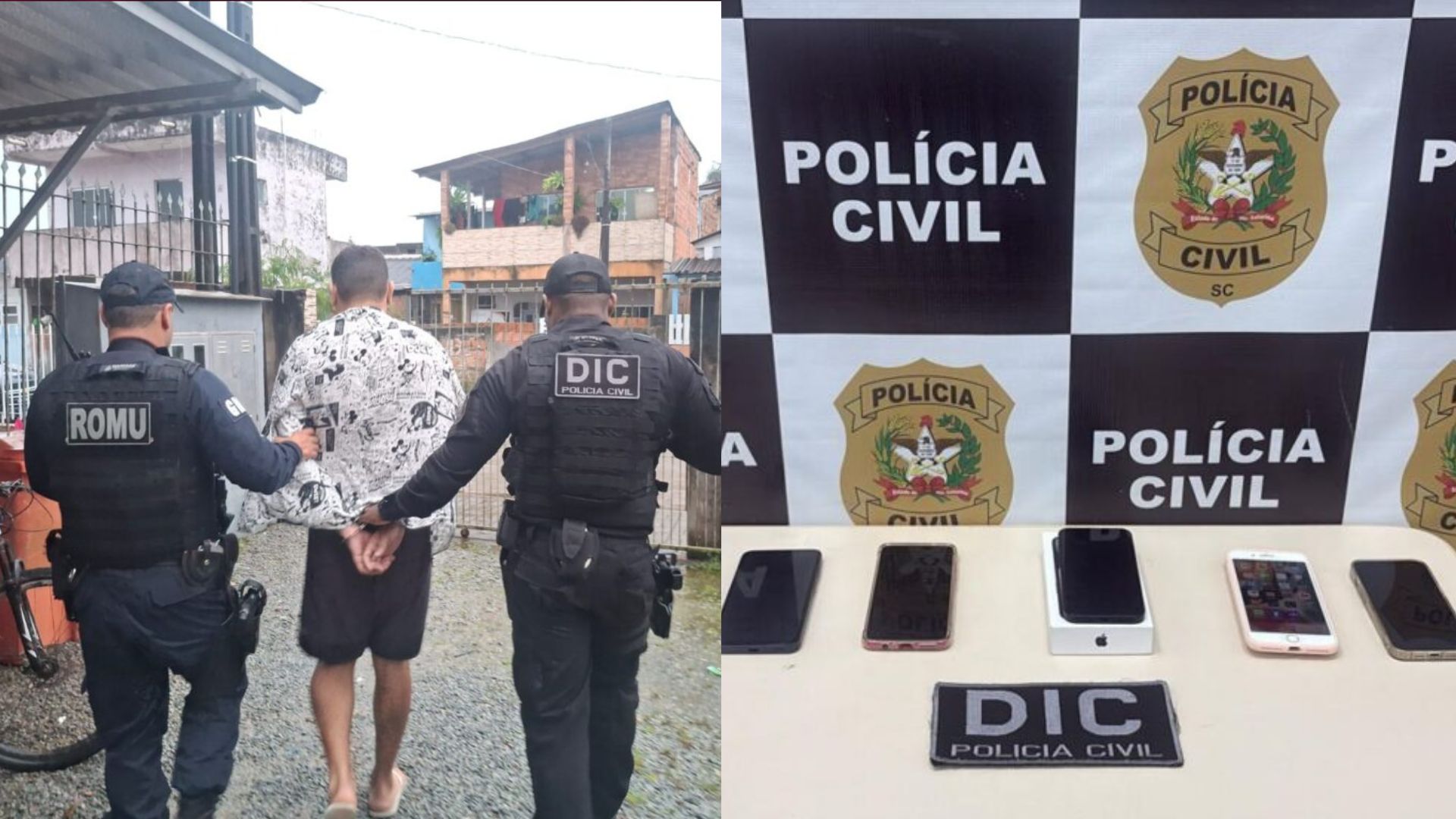 Um homem suspeito de colaborar com um assalto a um estabelecimento comercial em Palhoça, na Grande Florianópolis, foi preso na manhã desta quarta-feira (29) no município. Além do mandado de prisão, a Polícia Civil de Santa Catarina (PCSC) também cumpriu seis mandados de busca e apreensão, que resultaram na recuperação de alguns dos aparelhos celulares subtraídos.