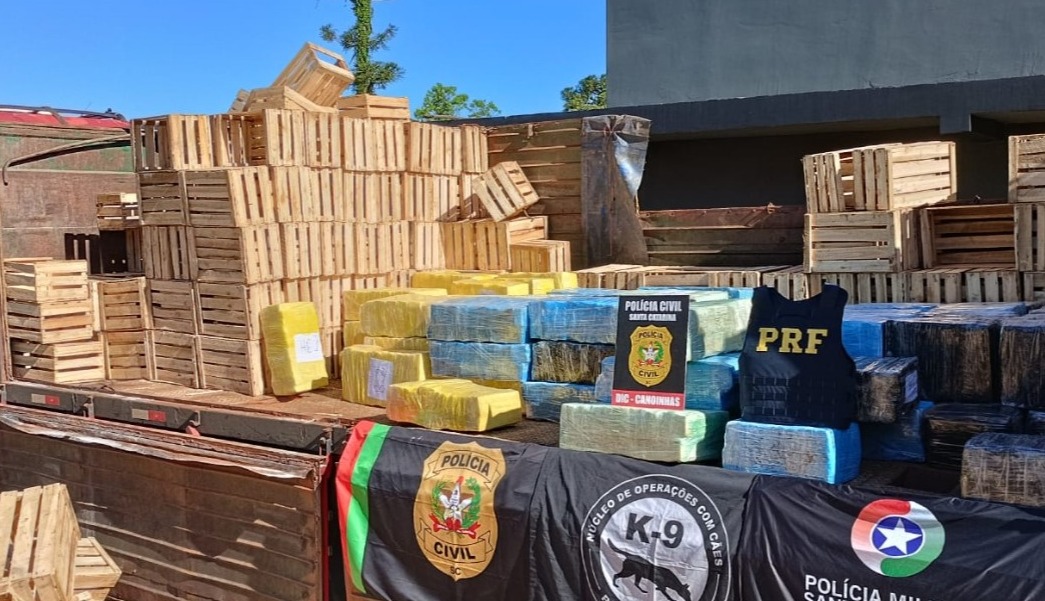 A interceptação ocorreu depois de troca de informações entre as quatro forças de segurança. Assim, os policiais localizaram e abordaram o veículo suspeito, um Scania placas do Paraguai. O cão farejador “Fuzil”, da Polícia Civil de Canoinhas, foi acionado e confirmou a presença da droga escondida debaixo da carga de caixas de madeira.