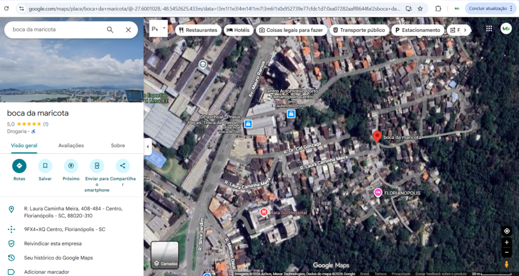 Um ponto de tráfico de drogas passou a chamar a atenção em Florianópolis após ser cadastrado de forma irregular no Google Maps com o nome “Boca da Maricota”. O local fica no Morro da Mariquinha, a cerca de 500 metros da Avenida Mauro Ramos, uma das principais vias da região central, e também nas proximidades do Instituto Estadual de Educação, a maior escola pública estadual da capital catarinense.